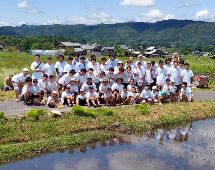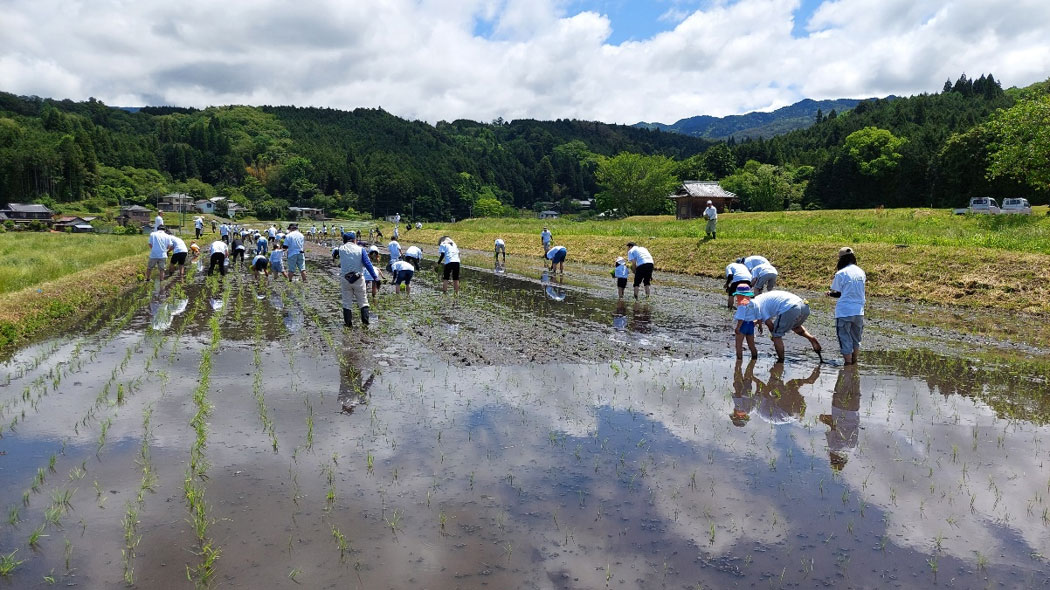 田植え初体験の新入社員や体験済みの先輩も一緒になって頑張ります。